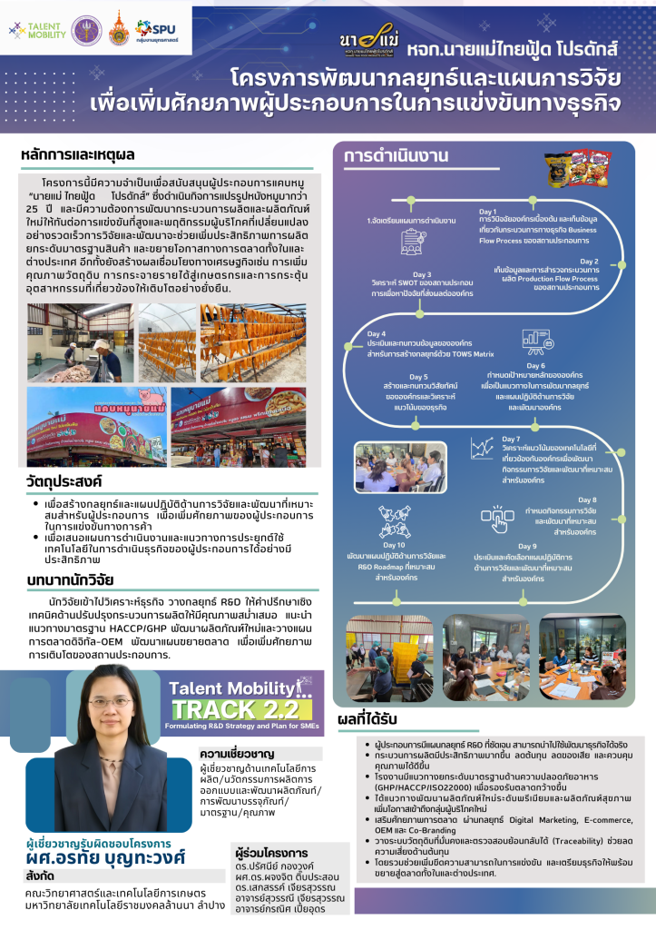 กลุ่มงานยุทธศาสตร์ SPU ได้สนับสนุนการดำเนินโครงการภายใต้ Talent Mobility Track 2.2: Formulating R&D Strategy and Plan for SMEs โดยส่งเสริมนักวิจัยเข้าไปทำงานร่วมกับสถานประกอบการ “นายแม่ไทยฟู้ด โปรดักส์” ซึ่งเป็นธุรกิจอาหารแปรรูปที่มีประสบการณ์ยาวนานกว่า 25 ปี และมีศักยภาพในการเติบโตสู่ตลาดที่กว้างขึ้น โดยมี ผศ.อรทัย บุญทะวงศ์ ผู้เชี่ยวชาญด้านเทคโนโลยีการผลิต/นวัตกรรมการผลิตการออกแบบและพัฒนาผลิตภัณท์/การพัฒนาบรรจุภัณท์/มาตรฐาน/คุณภาพ สังกัด คณะวิทยาศาสตร์และเทคโนโลยีการเกษตร มหาวิทยาลัยเทคโนโลยีราชมงคลล้านนา ลำปาง เป็นหัวหน้าโครงการ และคณะ