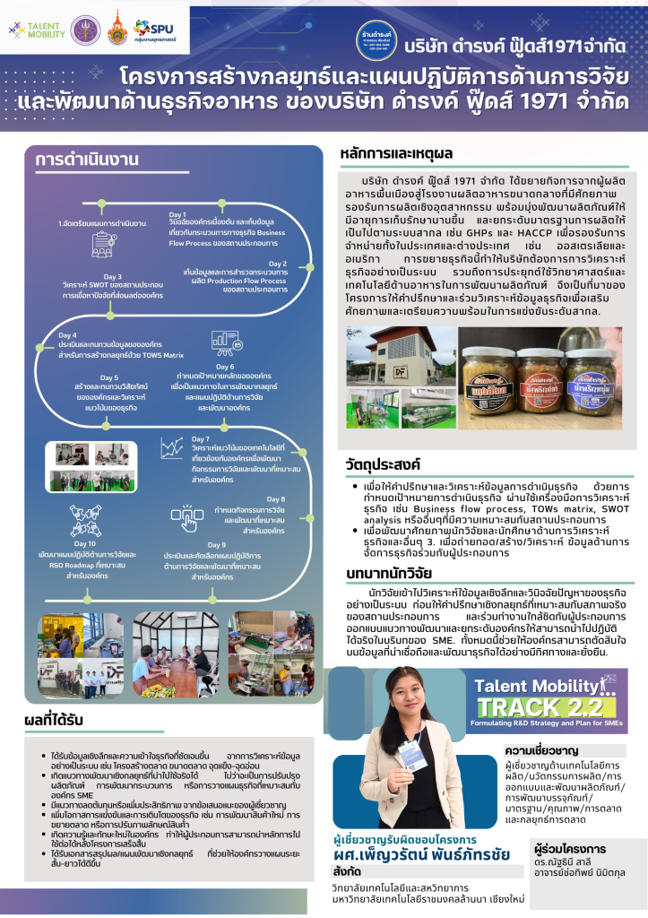 กลุ่มงานยุทธศาสตร์ SPU ได้สนับสนุนนักวิจัยดำเนินโครงการร่วมกับ บริษัท ดำรงค์ ฟู้ดส์ 1971 จำกัด ภายใต้กรอบ Talent Mobility Track 2.2 เพื่อยกระดับธุรกิจอาหารแปรรูปให้มีความพร้อมในการแข่งขันในระดับสากล โดยมี ผศ.เพ็ญวรัตน์ พันธ์ภัทรชัย ผู้เชี่ยวชาญด้านเทคโนโลยีการผลิต/นวัตกรรมการผลิต/การออกแบบและพัฒนาผลิตภัณท์/การพัฒนาบรรจุภัณท์/มาตรฐาน/คุณภาพ/การตลาดและกลยุทธ์การตลาด สังกัด วิทยาลัยเทคโนโลยีและสหวิทยาการมหาวิทยาลัยเทคโนโลยีราชมงคลล้านนา เชียงใหม่ เป็นหัวหน้าโครงการพร้อมคณะ