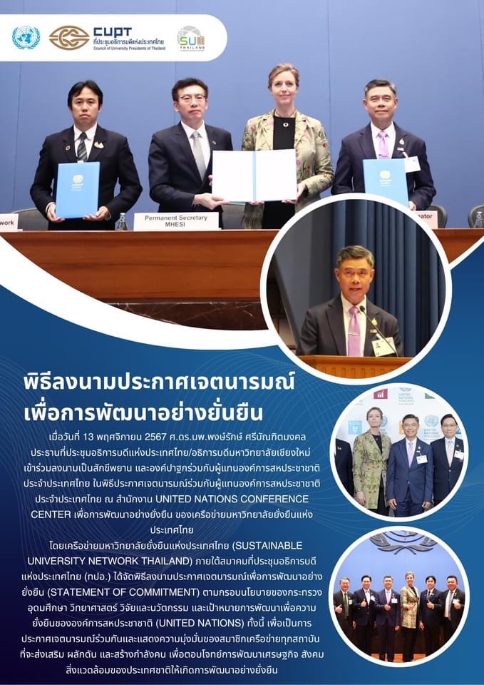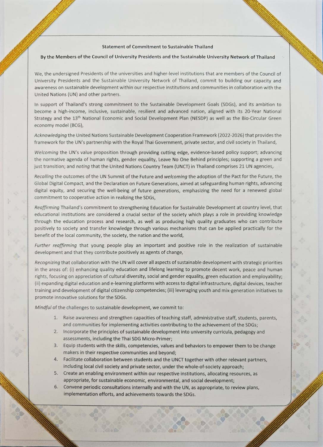 This year, RMUTL reaffirmed its dedication to sustainable collaboration by participating in the signing ceremony of the Declaration of Intent for Sustainable Development at the United Nations Headquarters, Thailand, located on Ratchadamnoen Nok Road, Bangkok. The event brought together universities and institutions nationwide to promote partnerships that drive collective progress toward sustainability.