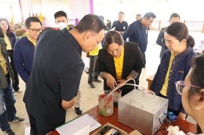 - The team visited three ongoing projects, including “Innovation in Egg-Laying Chicken Feed Using Local Ingredients Based on the King’s Philosophy,” led by Ms. Usaneephon Soiphet from the Faculty of Science and Agricultural Technology, RMUTL Phitsanulok. The project develops low-cost, high-quality feed formulas for the Happy Egg Chicken Community Enterprise in Phitsanulok, using fresh red azolla as a sustainable protein source.