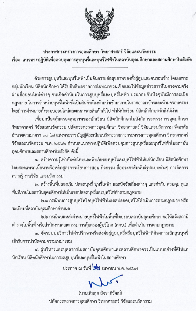 Institutions must fully comply with the Tobacco Products Control Act B.E. 2560 (2017), which prohibits smoking in all educational premises and requires active monitoring and enforcement. - Prohibit the sale and promotion of tobacco and e-cigarette products on campus