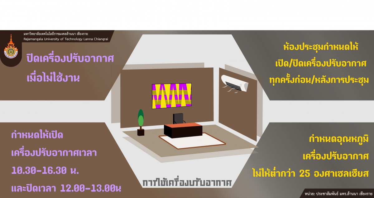 Key actions include the mandatory shutdown of air-conditioning units when not in use and the establishment of standard operating schedules in meeting rooms—systems must be switched on only shortly before meetings and turned off immediately afterward. To optimize energy usage, air conditioning is permitted only between 10:30 a.m. and 4:30 p.m., with a lunch-hour pause from 12:00 p.m. to 1:00 p.m. In line with Thailand’s energy conservation regulations, all air-conditioning units must be set at a temperature no lower than 25°C.